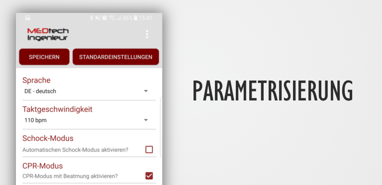 The defibrillator trainer's parameterization represents a significant improvement over the analog remote control. Where previously complicated key combinations were required to change the language, for example, a maximum of three clicks are now sufficient. The language of the audio output and the beat speed of a metronome for CPR can be configured via a selection menu. The app synchronizes the settings when it is first connected to the defibrillator trainer, ensuring the most current settings are always displayed.