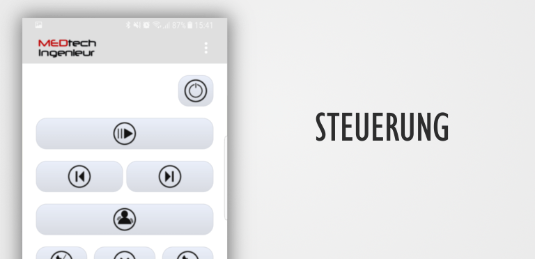 The button layout is modeled on the analog radio remote control. The logos have also remained identical. From here, you can take the trainer out of standby mode or put it into standby mode, play or pause the sequence, switch between different steps, or adjust the trainer's volume. Other trainer-specific commands are also possible. The layout can, of course, be easily adapted to other trainers or devices.
